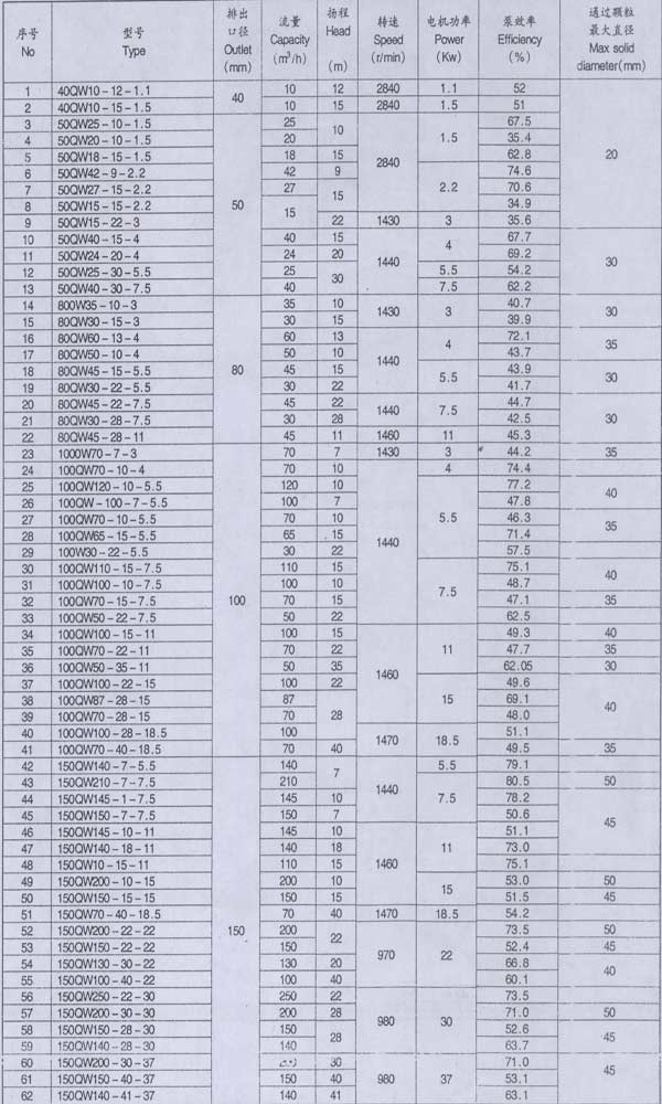 QW型系列混流式潛水泵系單級(jí)、單吸、軸向吸入、立式、機(jī)電一體、葉輪與電機(jī)軸直聯(lián),潛入泥漿、原油或清水等介質(zhì)中工作,輸送介質(zhì)的混合物比重為1:1-1:1.45。是油田石漬鉆井過(guò)程中抽送漿、清水或原油至循環(huán)泥漿池最理想的配套設(shè)備。也是電廠礦山、煉油、造紙、印染、環(huán)保、市政工程、化工、漁塘鹽廠、釀造、大理石廠、建筑、煤礦等行業(yè)抽排泥漿和污水理想的泵型。同時(shí),也可根據(jù)用戶的實(shí)際使用要求及介質(zhì)情況,設(shè)計(jì)生產(chǎn)其它規(guī)格型號(hào)產(chǎn)品.